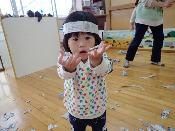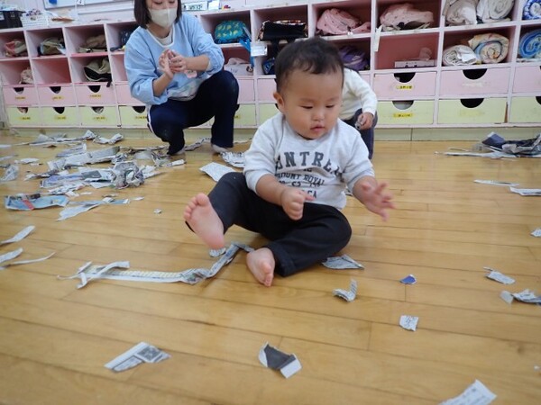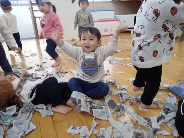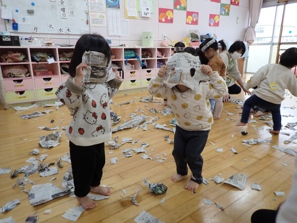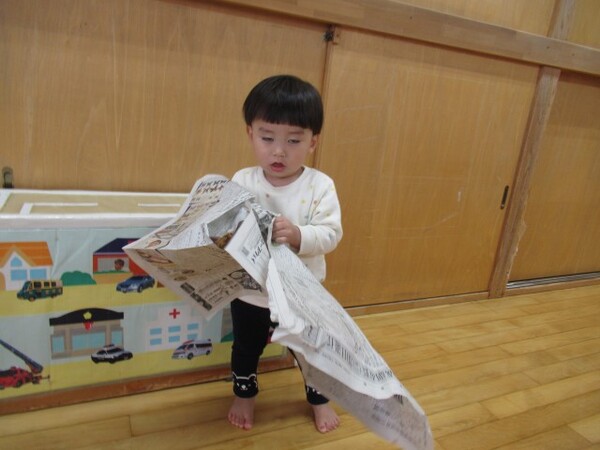 新聞紙をビリビリビリ〜!!破いたり丸めたり…お面にしたら、おばけみたい!?ダイナミックに新聞紙遊びを楽しみました!楽しかったですね♪