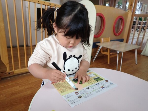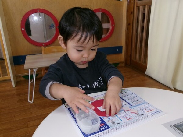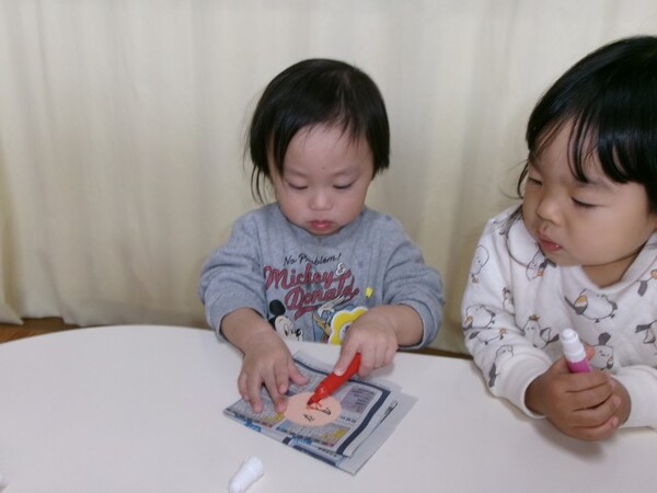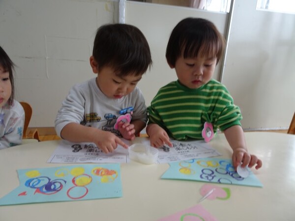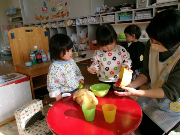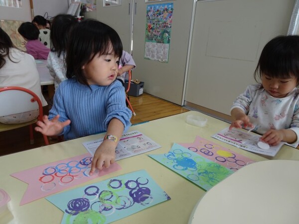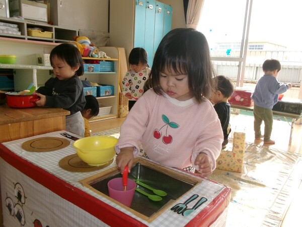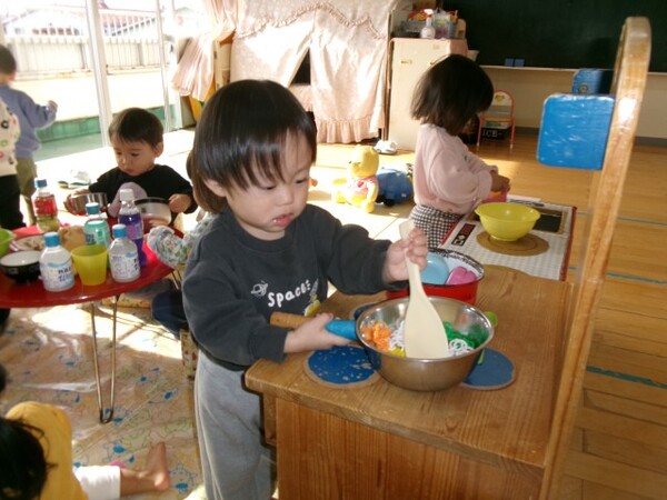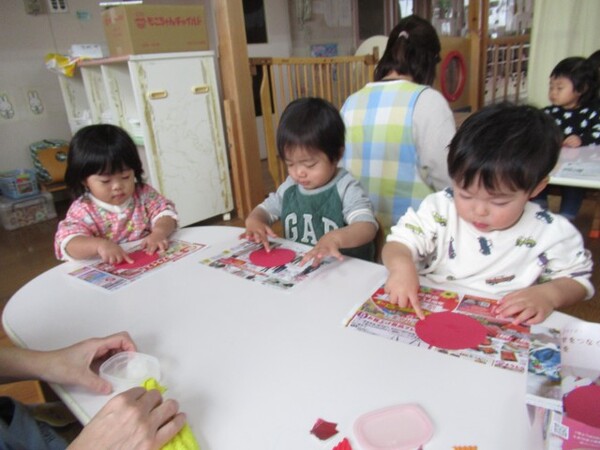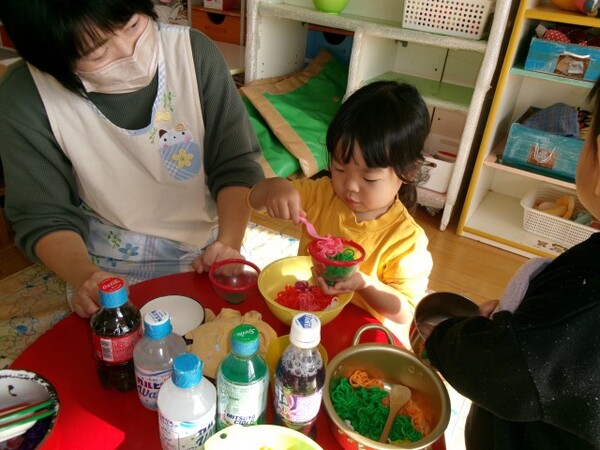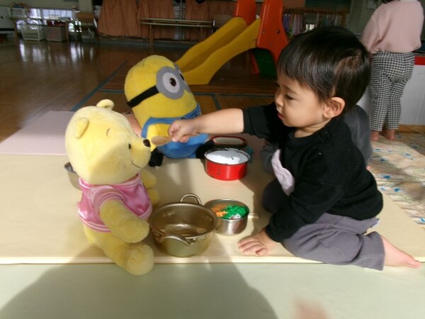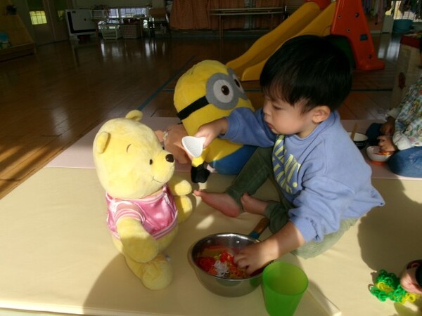 ままごと遊びが大好きなたんぽぽ組さん。色付きのチェーンリングをお鍋に入れて混ぜまぜ…何ができたかな?お人形に食べさせてあげる姿にはホッコリ♪かわいい姿がたくさん見られました。楽しかったですね♪