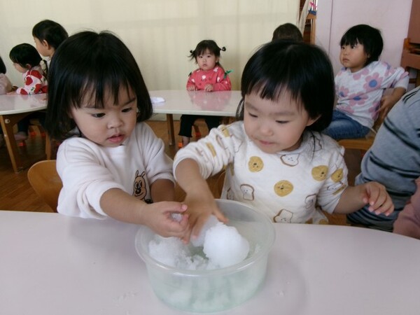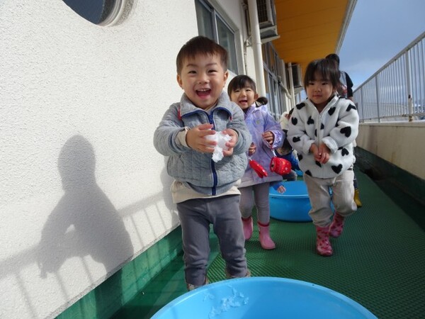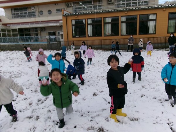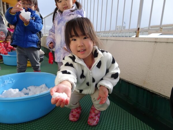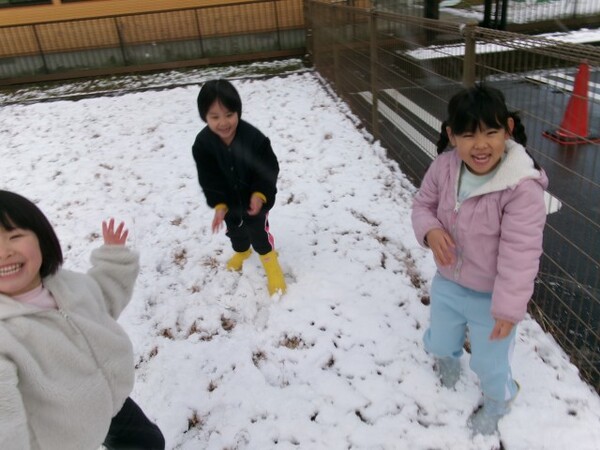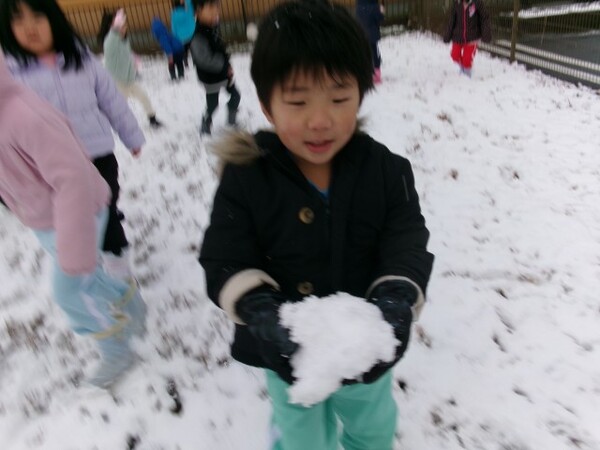 初雪が降り、朝から興奮気味の子どもたち。「雪が降ったよ〜!」「雪だるま作りた〜い」と目をキラキラさせています。さっそく、防寒着を着て園庭へ。雪を踏む感触や、雪の冷たさを味わいながら楽しそうに遊んでいました。「楽しかったね」「明日も積もるかな?」との声も。小さいクラスのお友だちもテラスやお部屋で雪に触れてみました。楽しかったですね♪