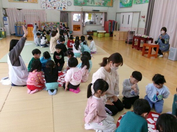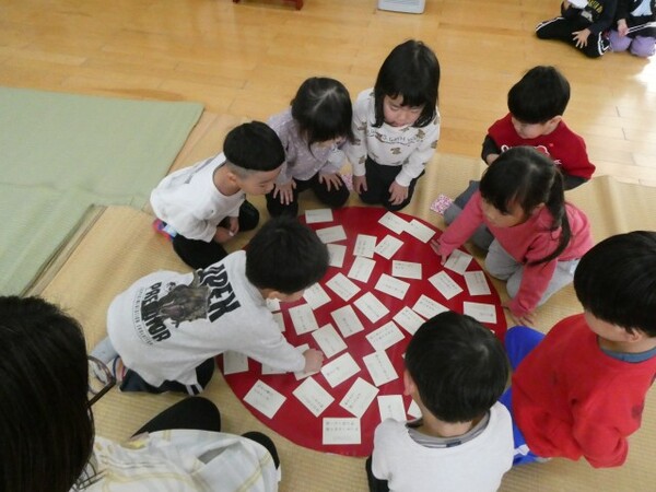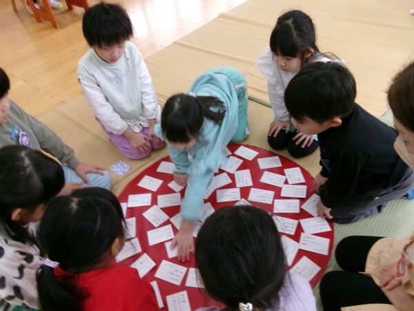 12月8・9日は、園内漢字かるた大会でした。日頃から諺や俳句をたくさん覚えてかるた遊びを楽しんでいる子どもたち。「今日はいっぱい取るぞ!」とはりきって参加していました。「ハイ!」と元気よく札を取る姿はとっても素敵です。みんなよく頑張りました!