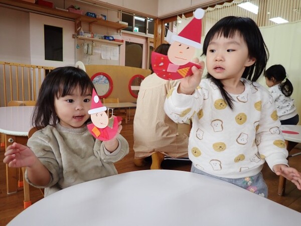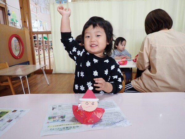 お洋服になる土台には、かわいい飾りをのりでペタン。お顔にグルグルと目や口を描いたら…ユラユラゆれるかわいいサンタさんができました!クリスマスツリーに飾るととっても素敵です。クリスマスが楽しみですね♪