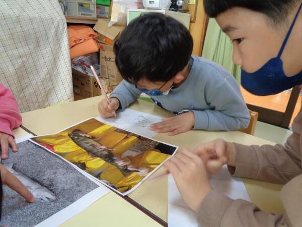 月間絵本のシール貼りをしました。今月はこいのぼりのシール。青空に泳がせるように貼る子、本物の鯉のぼりのように並べて貼る子…「あか〜」「きいろだ!」と色に関心を持つ姿も見られました。上手にできましたね♪