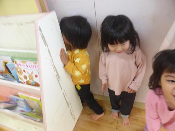 今日は、遊戯室で遊びました。広い遊戯室に、目をキラキラさせて大喜び!三角すべり台をシューっと滑ったり、動物マットに乗ってみたり…大きなトランポリンマットは大人気で、ゆらゆら、ごろ〜んと感触を楽しんでいました。たくさん体を動かして遊びました。楽しかったですね♪