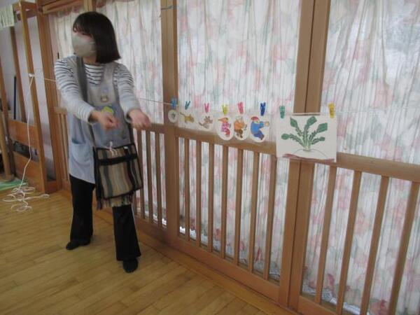 ゆり組さんが作っている姿をさくら組さんが興味津々に見ていると…「いっしょに作ろう!」と誘ってくれました。「テープ切れる?」「こう貼るんだよ」とゆり組さんが優しく教えてくれて、かっこいい“吹き流し”が完成しました。早速広い遊戯室を思い切り走って「見てみて!」「きれいだね〜」と楽しそうに遊んでいました♪
