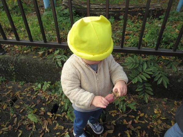 今日は朝から良い天気♪ぽかぽか陽気に誘われて、園庭で遊びました。自然物にも興味津々。草花を触ったり、草の上を歩いたり這ったりしながら、全身で感触を味わっていました。たくさん遊んで楽しかったですね♪