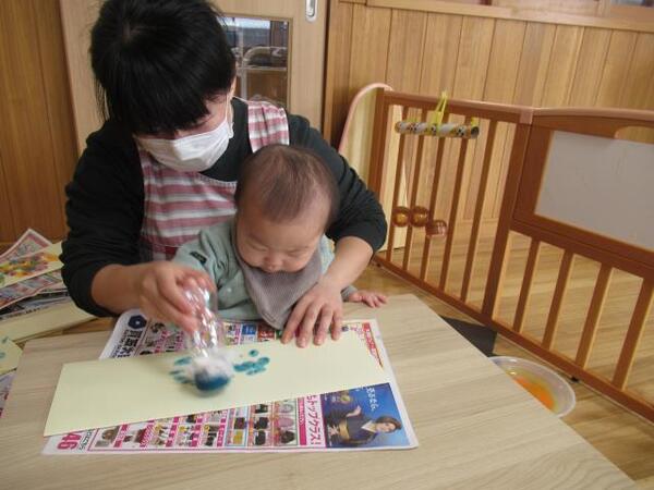 こいのぼりの個人製作は、はじき絵に挑戦。新しいピカピカのクレヨンで模様を描いてから、絵の具で色を塗りました。大きなこいのぼりを共同制作した経験から、うろこや模様を工夫して描く子が多くいました。絵の具にも興味津々。「何色にしようかな〜」とにこにこ楽しそうに塗っていました。どんなこいのぼりが完成するかな?楽しみですね♪