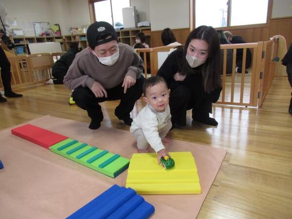 今日は保育室にいろいろな運動遊具を出して遊びました。巧技台のはしごやすべり台は大人気。両手足を上手に使って渡っていました。トランポリンではバランスを取りながらピョンピョン!保育者と手をつないで跳ぶことも楽しくて「もっと!」「私も!」と喜んで遊んでいました。外は雨でしたが、室内で体をたくさん動かして満足そうな子どもたちでした♪