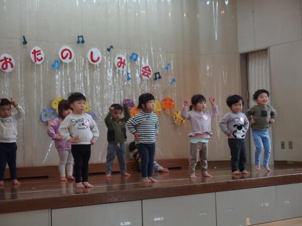 今日は『お祝い会』でした。こどもの日を前に、進級・入園してひとつ大きくなったことをみんなでお祝いしました。こいのぼりの由来『竜門の滝』のシアターを見た後は、各クラスの手作りこいのぼりをお披露目。たんぽぽ組さんの小さな手形のこいのぼりには「かわいい〜!」と声があがりました。そして、保育園で一番お兄さんお姉さんのゆり組さんが、他のクラスのお友だちに折り紙をプレゼントしてくれました。「一緒に遊ぼうね」「ありがとう」とかわいいやりとりにほっこりしました。小さいお友だちのためにプレゼント作りを頑張ってくれたゆり組さんには、園長先生からサプライズプレゼント!!かっこいい兜をいただきました。「かっこいい!」「やったー!」と大喜びのゆり組さんでした。