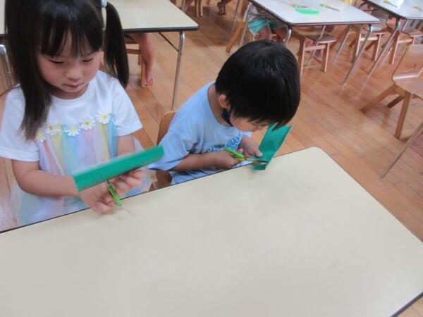 先日のまつぼっくりを絵の具で塗り、ビーズや毛糸で飾りつけをしたら、ミニクリスマスツリーができました。小さくてかわいくって…「かわいい〜」「私のもかわいいよ〜」と、とっても大事そうに作っていました。切り紙で“雪の結晶”を作り、ツリーの台座も完成!大きなツリーの横に飾って嬉しそうな子どもたちでした。