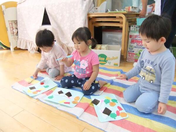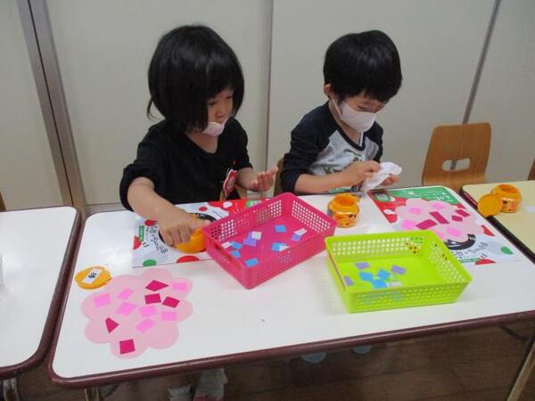 スポンジで絵の具をトントン…おばけの形ができた〜!!色紙をちぎって並べてみると…「お顔になったよ!」と大喜び。のりでペタペタ、上手に貼っていました。で貼りました。かわいい帽子も貼って、表情豊かでとってもかわいいおばけが完成しました!!