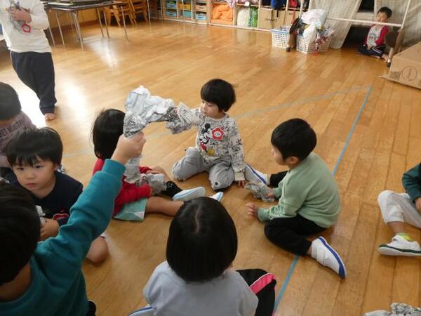新聞紙をビリビリ〜ッと破いたり、小さくちぎったり…夢中になって遊んでいました。雨のように上から降らしてあげると「キャー!」と大喜び!引き車にも新聞紙を拾い集めたりと、遊びが広がってとても楽しそうな子どもたちでした♪