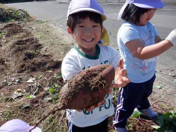 プランターに植えたナスの苗がどんどん生長して、大きなナスの実がなりました。さっそく、ゆり組さんが収穫。トゲが痛いから、慎重に…「見て見て〜!ピカピカしてるよ!!」と大喜びの子どもたち。調理の先生にお願いして、給食に添えてもらいました。「おいしい!」「食べられたよ」と、とっても嬉しそうでした♪