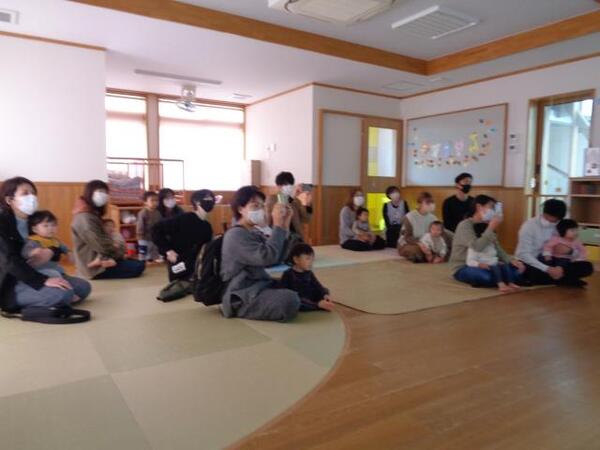 クラス対抗、大型オセロ合戦!!赤を白に、白を赤に…笛が鳴るまでパタンパタンと大型オセロを裏返し続けます。さぁ、どっちが勝ったかな!?「やったー勝った〜!!」「もう一回やりたい!!」と大盛り上がり。嬉しい気持ちやや悔しい気持ちをお友だちと共有しながら元気いっぱいに遊んで、満足そうな子どもたちでした。たくさん遊んだ後は、遊戯室をみんなで雑巾がけ。「僕もできるよ」と一所懸命してくれました。床がピカピカ、綺麗になって気持ち良かったですね♪