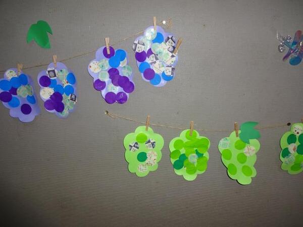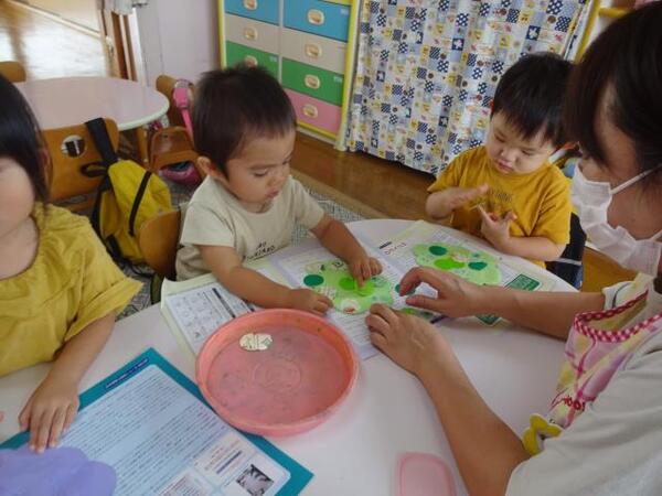 お花紙をクシャクシャしながら袋に詰めて、ペタペタシールを貼って…かわいい手形もペッタン!さて、何ができるかな?楽しみですね♪色や素材、感触に興味津々の子どもたちでした!