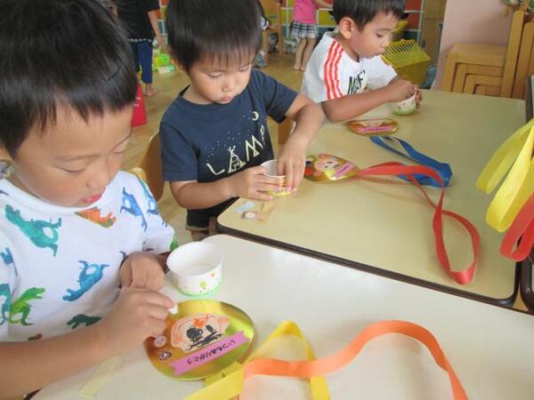 明日は七夕会☆彡 ゆり組さんのお部屋からなんだか楽しそうな声が…。「何か作っているの?」と尋ねてみると「…秘密だよ!」とのこと。そして夕方、ピンポンパンポ〜ン♪「お星さまの世界を作りました。遊びに来てください。待ってま〜す!」と園内放送が!『お星さまの世界』、いったいどんな世界なのでしょうか。楽しみですね♪♪