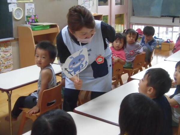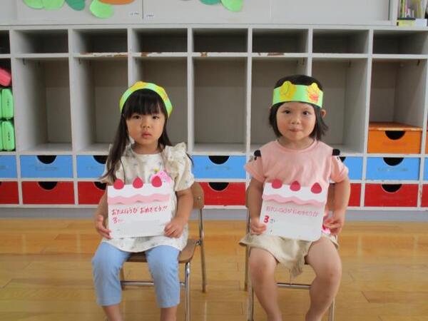お祝い会がありました。進級・入園して、大きくなったことをみんなでお祝いしました。保育士から名前を呼ばれて元気よく「は〜い!」とお返事。お祝いのシアターも喜んで見ていました。そして、ゆり組さんが折り紙のペンダントを作り「いっしょにあそぼうね!」とプレゼントしてくれました。ゆり組さん、ありがとうございました♪