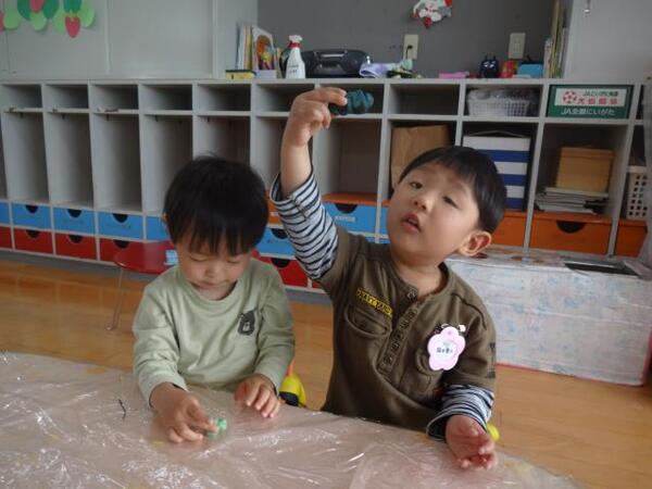 園庭で砂遊びをしました。砂の感触にはじめはちょっぴり不思議そうな表情を見せていた子も、慣れてくると両手で砂を触ったり、スコップですくってみたり…とても楽しそうに遊んでいました。途中でカエルを発見し、興味津々でのぞき込む子も。戸外でのびのび遊んぶことができました♪