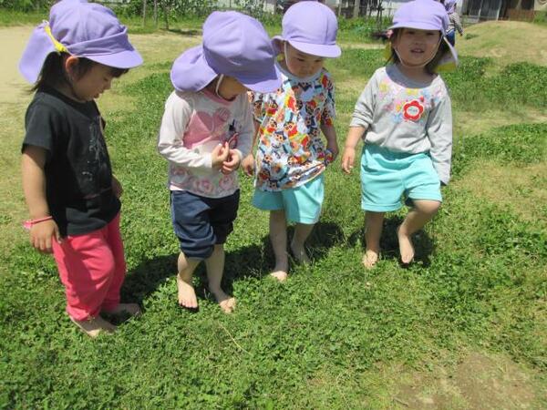 今日のテーマは『身近な生き物』。ムッレさんとのお約束を確認して、みんなで園舎まわりの農道に出発〜!「あ、アメンボ!」「カエルがいたよ!」と次々に発見する子どもたち。観察ケースやルーペでよく見てみると…「足が6本あるね」「この虫、おもしろい模様だよ」「ほんと?私も見せて!」と楽しそうなやりとりも聞かれました。そして、「この葉っぱの穴、虫が食べたのかな?」「この虫は何を食べるんだろう?」「土に穴が開いているよ。虫の巣かな?」と、思いを巡らせている姿も見られました。興味関心が広がってきているようです。自然にたくさん触れて遊んで楽しかったですね♪