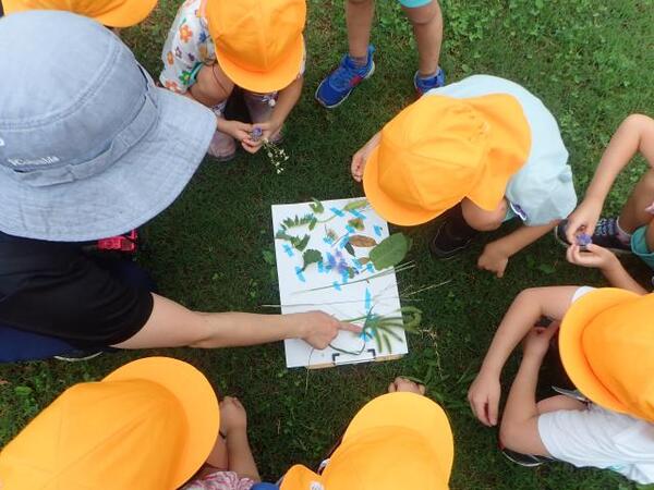 ゆり組さんの自然保育参加がありました。ムッレ教室で自然に触れて遊ぶ中で、草花の名前もたくさん覚え興味関心を広げているゆり組さん。今日は、お家の方と一緒に自然物のたたき染めをしました。好きな葉っぱを選んで、布に挟んでハンマーでトントントン…と叩くと、布に色が写ってとってもきれい!!「この葉っぱはよく色が出るね」「こっちはあまり出なかったな〜」とお家の方と話しながら、楽しそうに作っていました。すてきな作品ができましたね!
