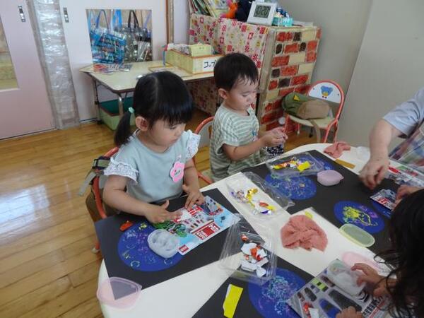 たんぽぽ組さんは、いつもと違う幼児棟で遠足ごっこを楽しみました。おもちゃのおにぎり、ハンバーグ、エビフライ…?好きなものをたくさん詰めて、おいしそうなお弁当を作っていました。楽しかったですね♪