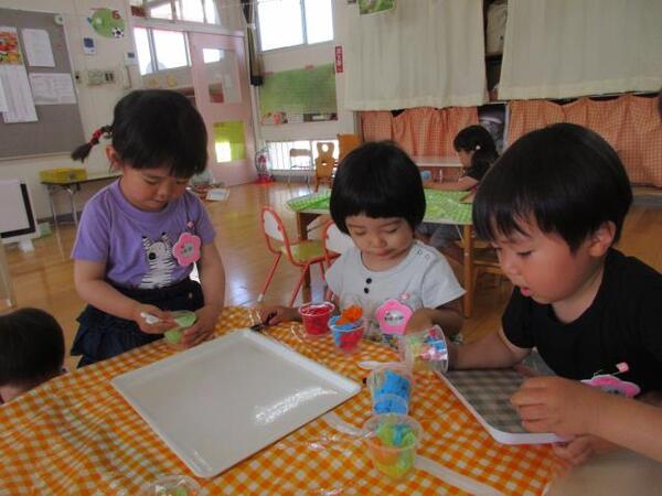 赤、白、黄色…好きな色を自分で選んで、折り紙でチューリップを折りました。「見て見て、できたよ!」と嬉しそうな子どもたち。指先を上手に使えるようになりました。みんなが作ったチューリップを並べたら、お花畑のようになりましたね♪