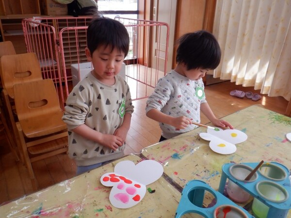 “バスブーム”のちゅうりっぷ組さん。四角い紙を黄色い絵の具でぬりぬり…窓やタイヤを貼ったら、保育園のバスと同じ、黄色いバスの完成!早速、手に持って「ブッブー」と走らせる姿も。窓の並べ方やタイヤの位置が様々で、とってもかわいいバスになりました♪