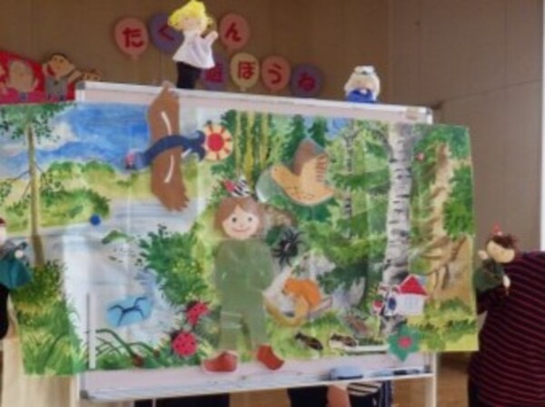 ムッレ教室のファイナルパーティーでした。雨のため室内での活動となりましたが、室内で自然の道クイズをしました。今までの活動を振り返りながら、『きのこの役割は?』『落ち葉はこのあとどうなるの?』など、お友だちと一緒に答えながら進みました。みんなよく覚えていましたね!そして、みんなでムッレの歌を歌っていると…「コリコーック!」なんとムッレさんがみんなに会いに来てくれました。ムッレさんのお話を目をキラキラと輝かせながら聞いていた子どもたち。一緒に遊んだり、素敵なプレゼントをもらったり…心に残る大切な時間となりました。ムッレ教室を通して、自然が大好きになった子どもたち。大好きな自然を大切にしようという思いが育ってくれることを願っています。これからも自然に触れながらたくさん遊びましょうね!