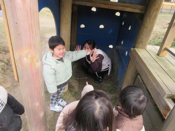 赤と青の大きな的をめがけて玉を投げると…ペタンとくっつく不思議な遊具。えい!っと一所懸命投げる姿がかわいい子どもたちでした。そして、くっついた玉を“ベリベリ〜”っとはがす感触も面白く、夢中になって遊んでいました。みんなで一緒に遊んで、楽しかったですね♪