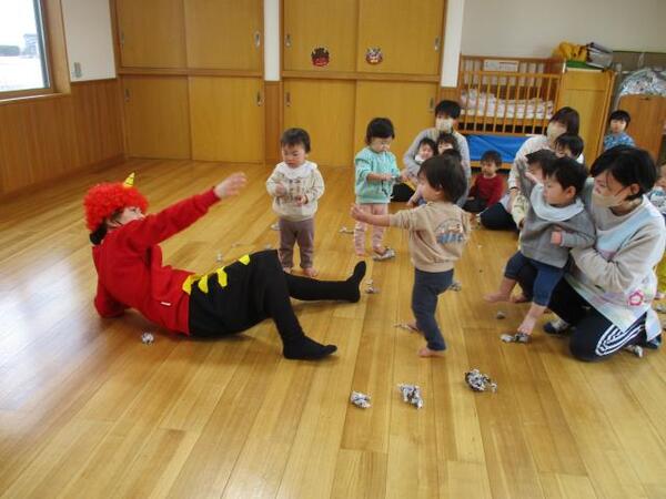 新聞紙をビリビリビリ〜!!穴の開いた新聞紙は、おばけのお面!?シャワーのように上から降らせると、「キャーー―!!」と大喜び!解放感たっぷりに楽しんでいました。面白かったですね♪
