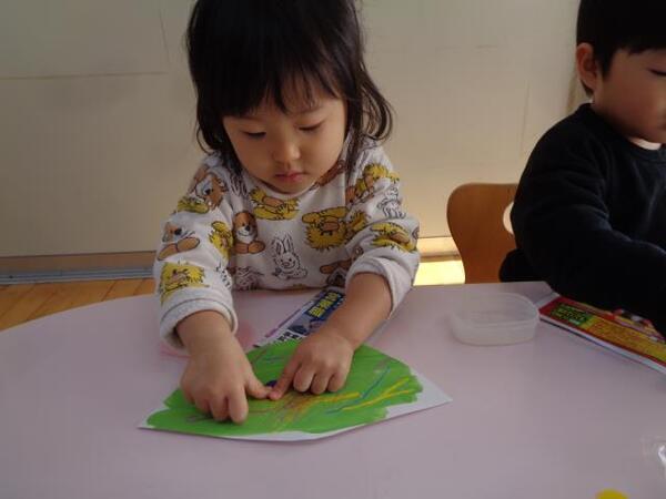 クレヨンでお絵描きしたところに絵の具を塗ると…絵の具がはじいてとっても綺麗!!好きな色を選んで楽しそうに塗っていました。素敵な模様のこいのぼりができそうですね♪