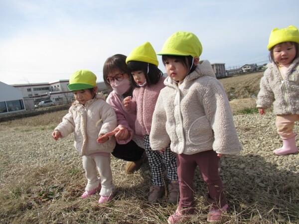 春の頃に、保育参加でお家の方と一緒に作った『引き車』を持って、園庭に遊びに行きました。広い園庭を、引き車を引きながらトコトコ歩く姿がかわいい子どもたち。石ころ、葉っぱ、草花などを、摘んだり拾ったりして遊んでいました。物を拾ったり集めたり、入れたり出したりすることが大好きな時期ですね。保育者のまなざしに気付いて、「ほら見て!」と見せてくれる子もいました。自然に触れながら楽しく遊びました♪