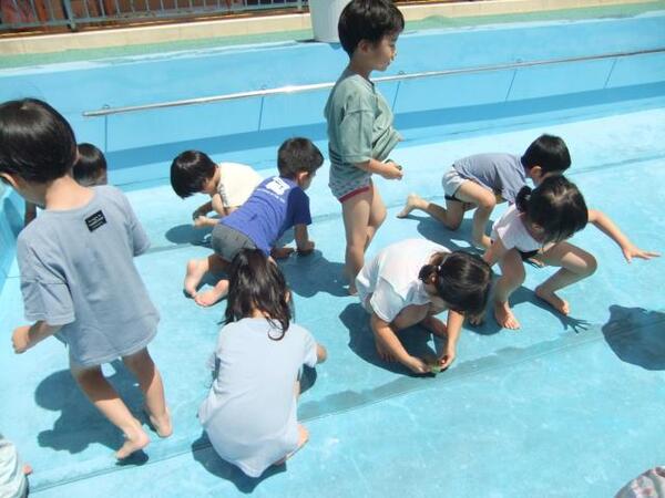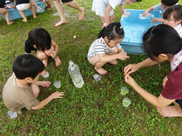 音楽に合わせて好きなところをお散歩♪音楽が止まったら…好きなフープの中に入ります。だんだんフープが少なくなってきて…最後まで残るチャンピォンはだれかな?「がんばれー!」とお友だちを応援したり、フープに入れなくて悔しがったり…にこにこ笑顔があふれて、とっても楽しそうな子どもたちでした。