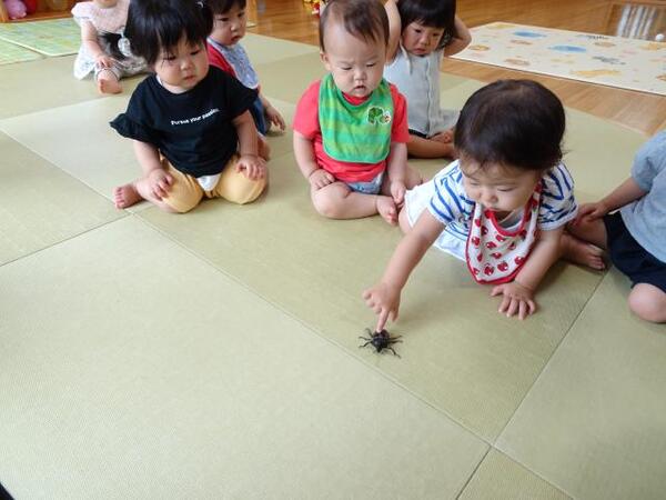 「もういいか〜い」「ま〜だだよ!」保育室でかくれんぼをして遊びました。おに役の保育者に見つからないように、“どこに隠れようかな…”と楽しそうに隠れ場所を探す子どもたち。中には、ダンゴムシのように体を丸めて小さくする子もいました。「み〜つけた!」の声にみんなニッコニコ♪賑やかな笑い声があふれていました。楽しかったですね♪