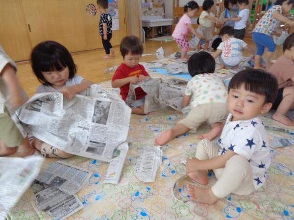 新聞紙をビリビリ〜!ダイナミックに遊ぶ子どもたち。さつまいもに変身した保育者が寝転がると、新聞紙を土のようにかけてくれました。蔓をみんなでひっぱって、「うんとこしょ、どっこいしょ!」といもほりごっこ。おいもが掘れたら「やった〜!」とみんなで大喜び!とっても楽しそうでした。最後は新聞紙を丸めてお芋作り。細長かったり、丸かったり…面白い形のお芋がたくさんできました!