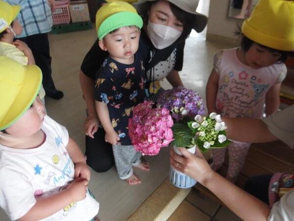 園舎脇の畑にさつまいもの様子を見に行ってきました。「葉っぱがいっぱ〜い!」「大きくなってるね」と嬉しそうな子どもたち。蔓を少しかき分けてみると、おいもの頭が見えて「あったー!!」と大興奮!「早く芋ほりしたいね〜!」との声も聞かれました。園庭では秋の草花でお料理ごっこ。見立てて遊ぶことが楽しいようで夢中で遊んでいました♪