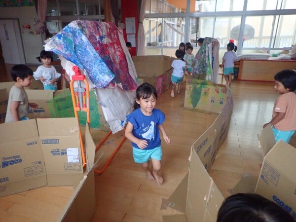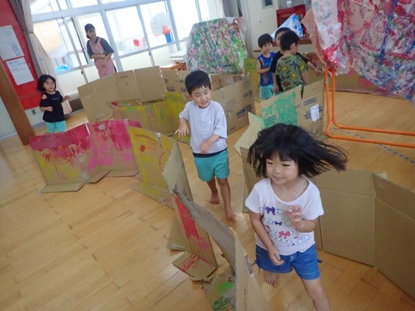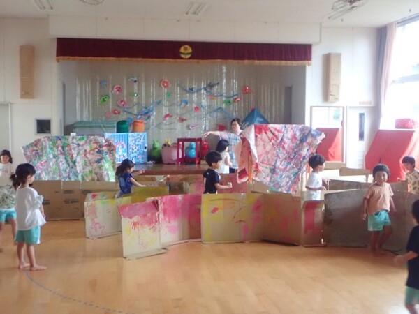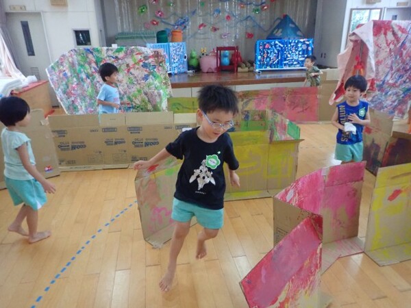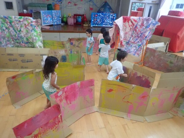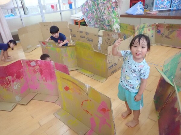 昨日の絵の具祭りで使った段ボールで迷路を作ってみました。「あ!これ僕たちが昨日絵の具塗ったんだよね!」と嬉しそうな子どもたち。迷路の中を行ったり来たりしながら楽しそうに遊んでいました。「簡単だったよ〜」「もっと難しいのも作って!!」との声も。…今度はどんな迷路にしようかな??