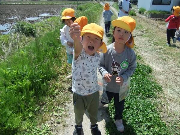 自然の中には発見がたくさん!木の実をみつけて、「どの木の実かな…?」と探したり、バッタ探しに夢中になったり…大きなカマキリも発見して「いたいたー!」「つかまえて〜!」「え〜、ちょっと怖いよ」と大興奮の子どもたちでした。青空の下でたくさん遊びました。楽しかったでね♪