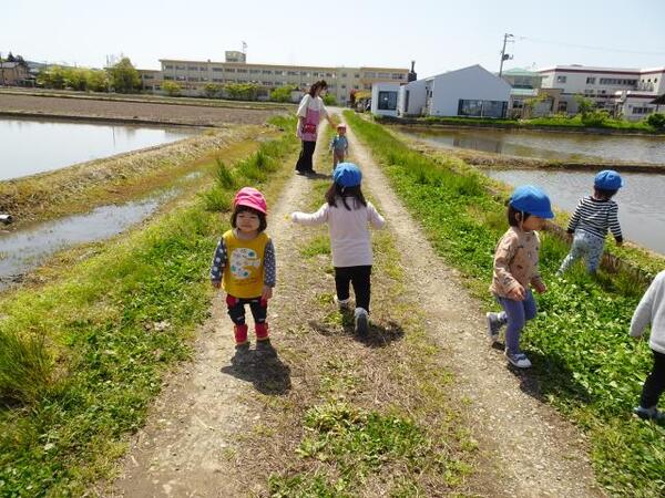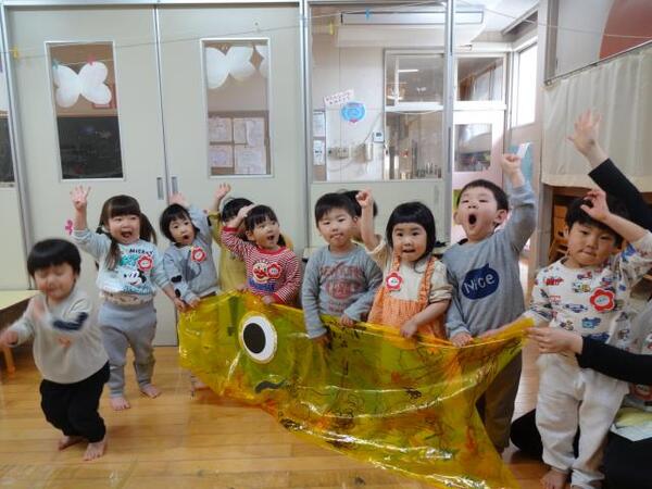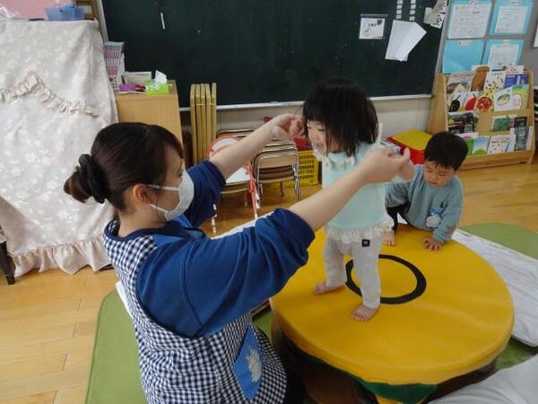 「あ〜ぶくたった〜煮えたった~♪」保育者や友だちと輪になって、楽しそうに遊んでいました。「トントントン」「何の音?」の掛け合いがおもしろく、「蛙の音!」「お風呂の音!」と自分で考えて応える姿も。「またやろうよ!」「もう一回した~い!」と、保育室に戻ってからも子どもたちだけで遊び始めていました。仲良く遊ぶ姿にほっこり♪みんなで遊ぶと楽しいですね!