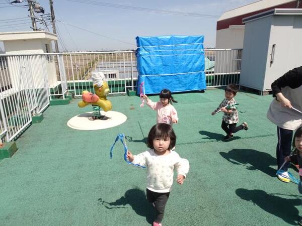 「おおかみなんか怖くないよ〜♪」と音楽に合わせてお散歩中。「おおかみさ〜ん!」と呼んでみると…おおかみさんがお昼寝から起きて、「ガオー――!」と追いかけてきました。追いかけっこ大好きな子どもたちは大喜び!「キャー!」と一所懸命逃げていました。つかまってもにっこにこ♪みんなで遊んで楽しかったですね♪