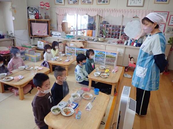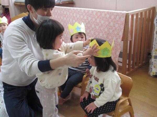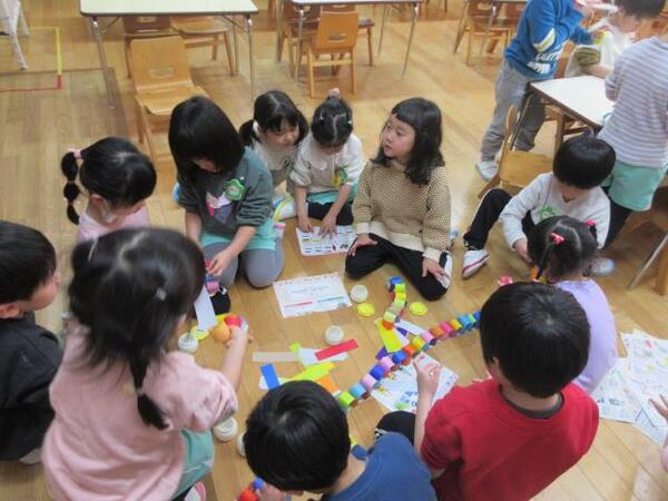 「おべんとうバスの仲間たちがいなくなちゃった!!みんな、探してくれるかな?」保育者の言葉に「は〜い!」と子どもたち。さっそく、保育室の中をみんなで大捜索。よ〜く探してみると…「あ!みかんちゃんいた!」「おにぎりさん見つけた!」とかくれんぼしていた仲間たちを発見!バスに乗せてあげながら「みんな集まったね」「よかったね〜」と嬉しそうに見ていました。とっても楽しかったようで「もう一回しよう」との声も。お友だちや保育者と楽しさを共有しながら遊ぶことができました♪
