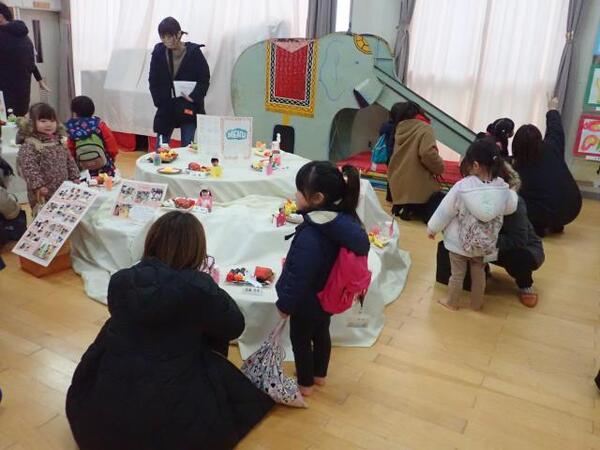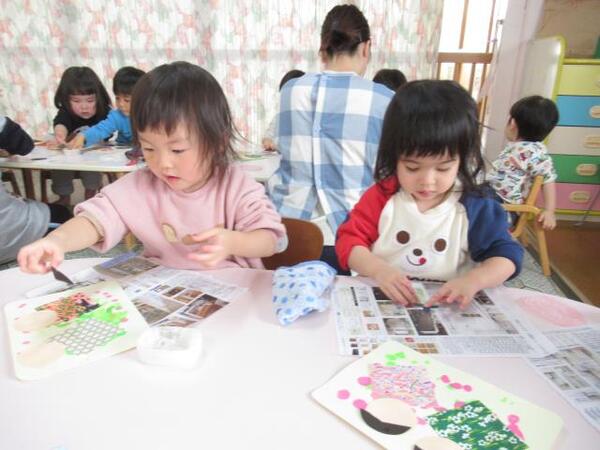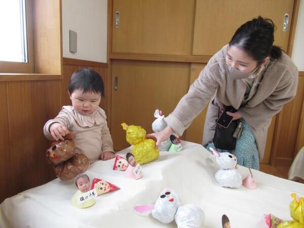 お花紙をクシャッと丸めてビニール袋に入れました。夢中になって何枚も入れる子、紙を入れたビニールごとクシャクシャっと丸める子…手指を上手に使って、楽しそうに遊んでいました。カラフルで、フワフワしていてとっても綺麗!そして、袋を結ぶと魚の形になりました。「おさかな!」と、指を差し嬉しそうな子どもたち。どんなお顔のおさかなが完成するかな?楽しみですね♪