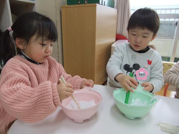 今月の折り紙は『ヨット』。海に浮かぶカラフルなヨットを作りました。角と角を合わせて上手に三角に折れましたね!帆には素敵な模様を描いて、とってもかっこいいヨットが完成しました。「ぼくのはここにしよう!」と、黒板に描いた海に浮かべていました♪