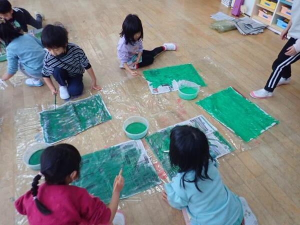 楽しく描いたら素敵な模様ができたので、お魚たちに変身させました。保育室の中を気持ちよさそうに泳いでいます♪