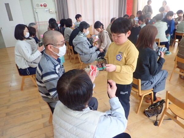 ゆり組さんからみんなへ、みんなからゆり組さんへ。プレゼントの交換をしました。ゆり組さんへは、小さいクラスからばら組さんまでみんなで協力して作りました。